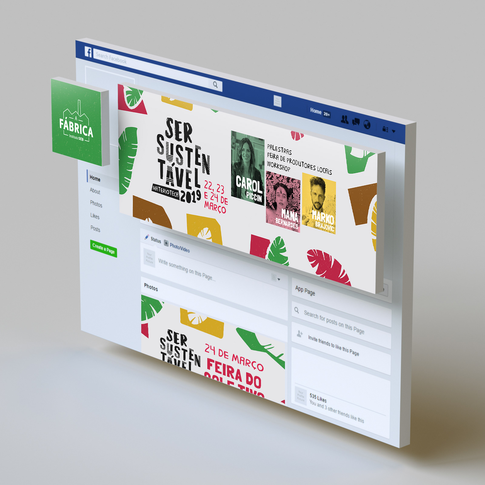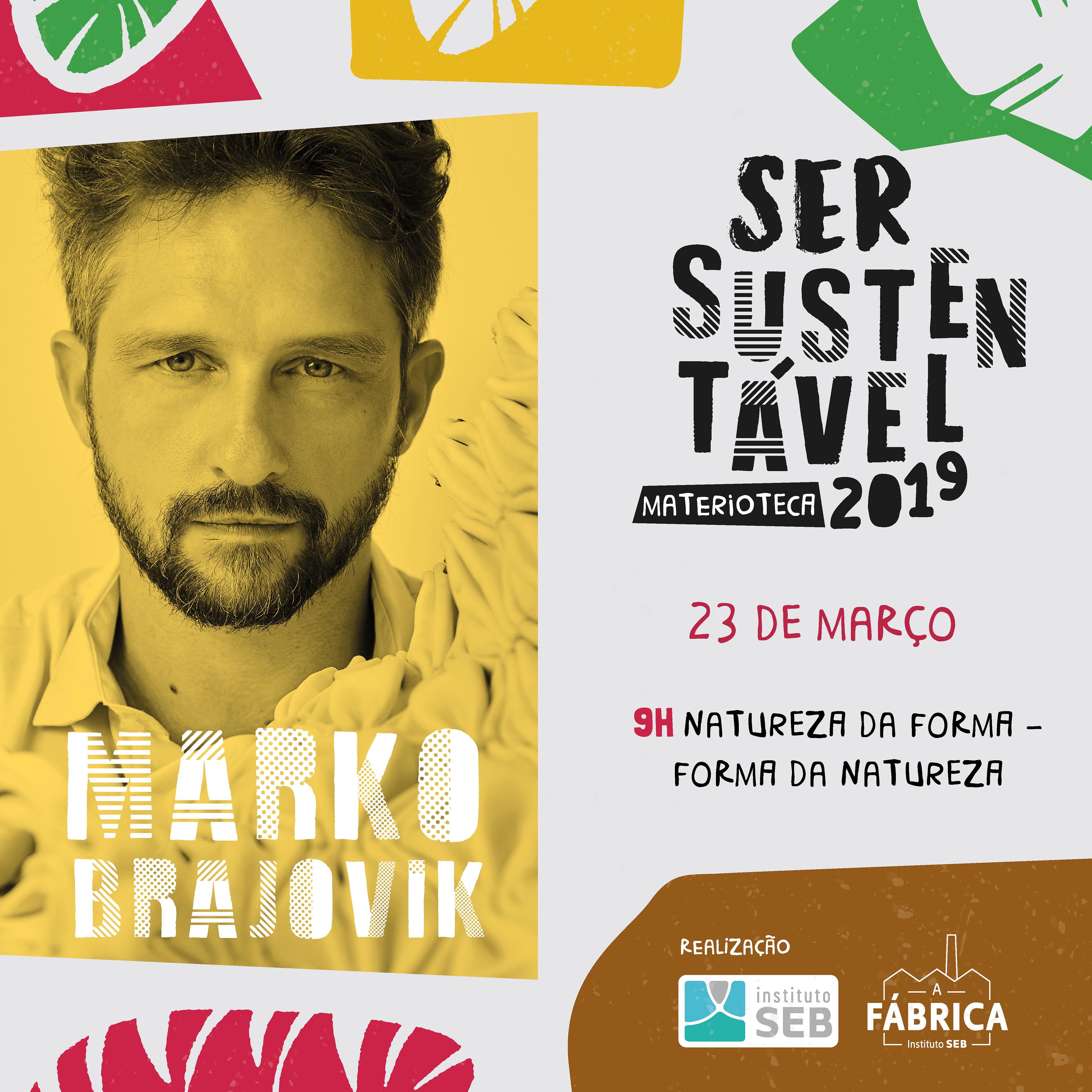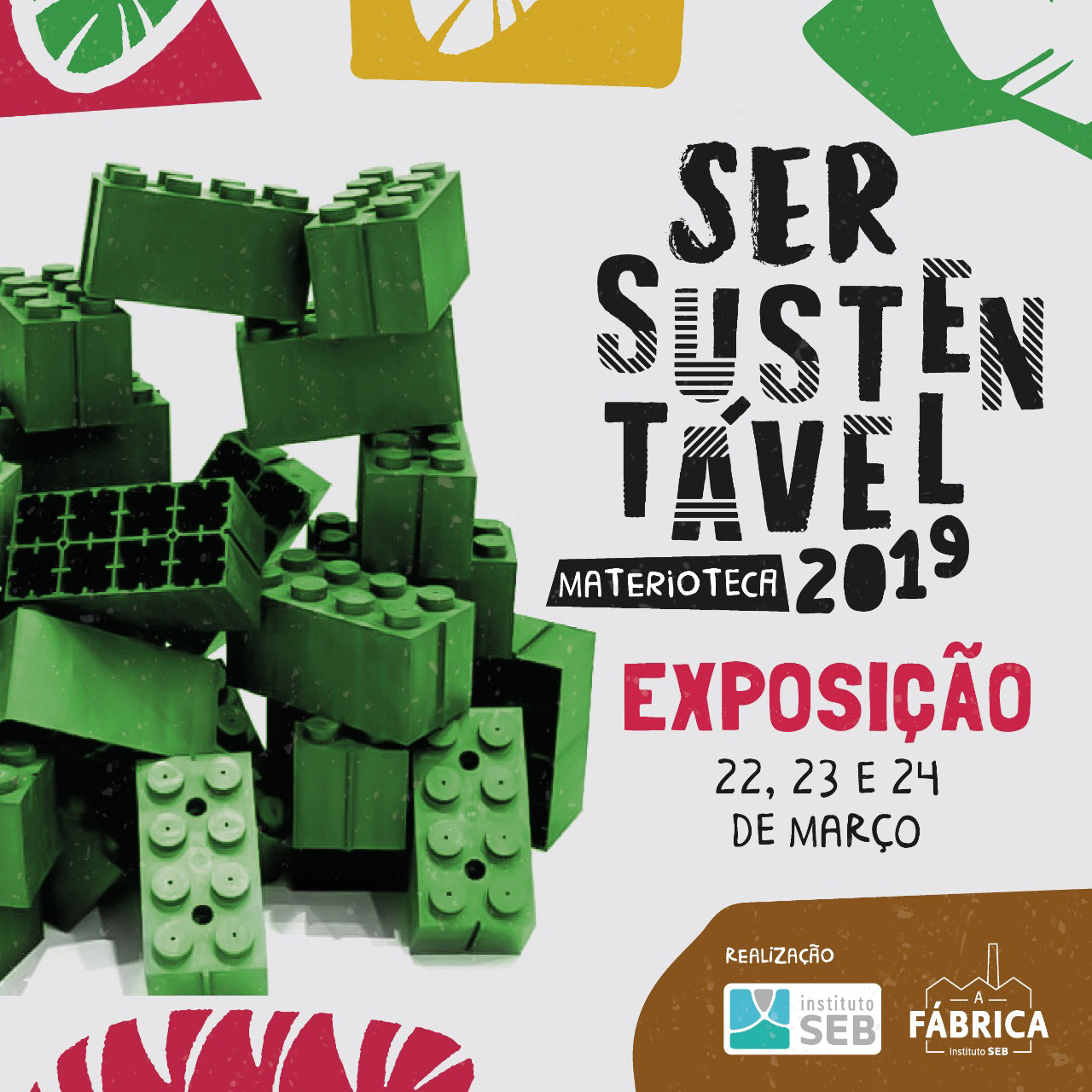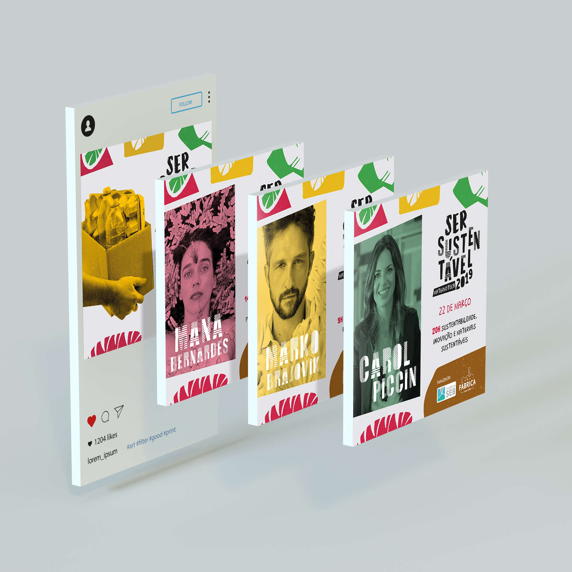 The challenge was to make a serious theme, exciting! Something that communicated with different publics and age groups. The result was the use of objects that refer to sustainability and the colour harmonies combined with a font with different shapes and textures, relating to the various sustainable materials.