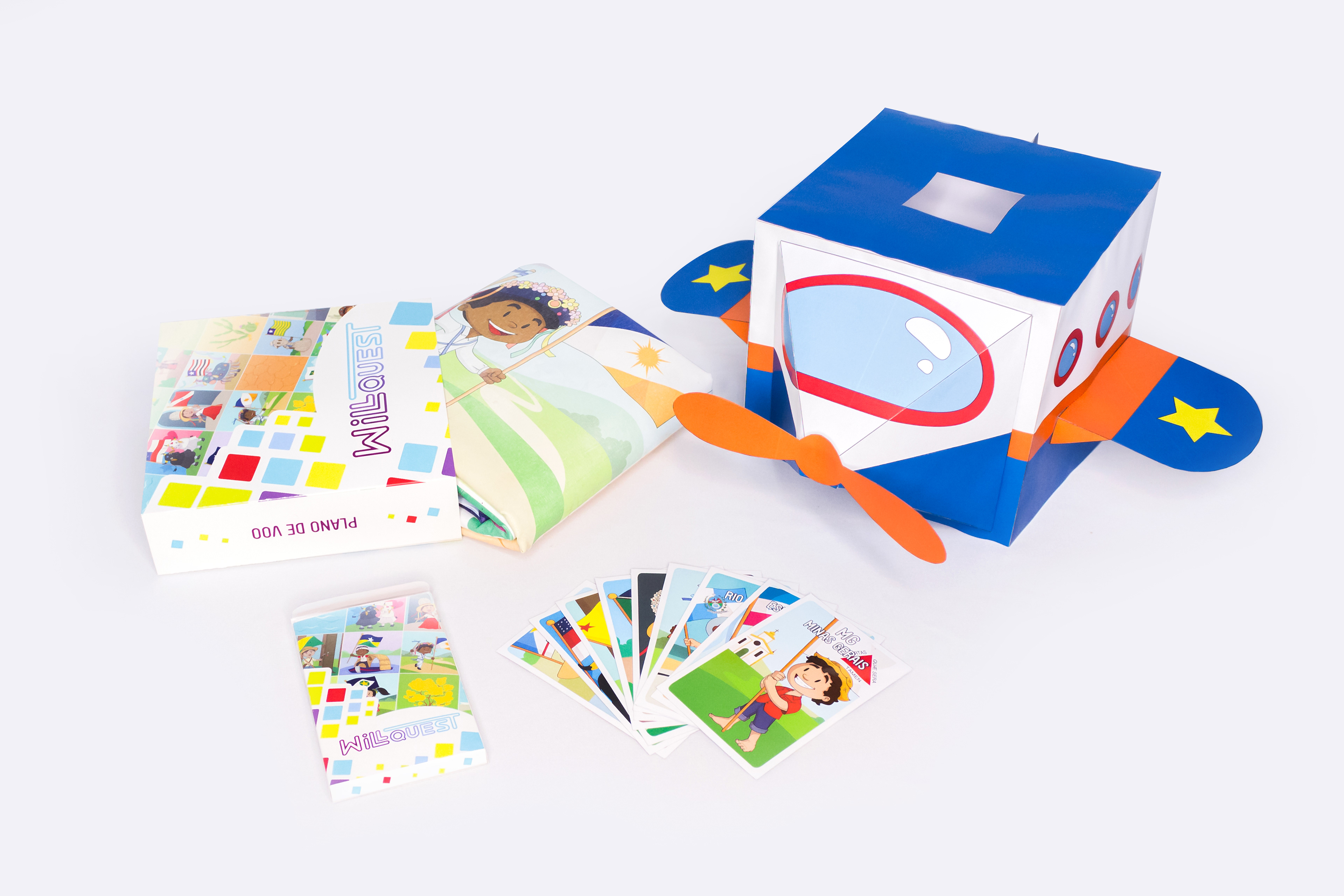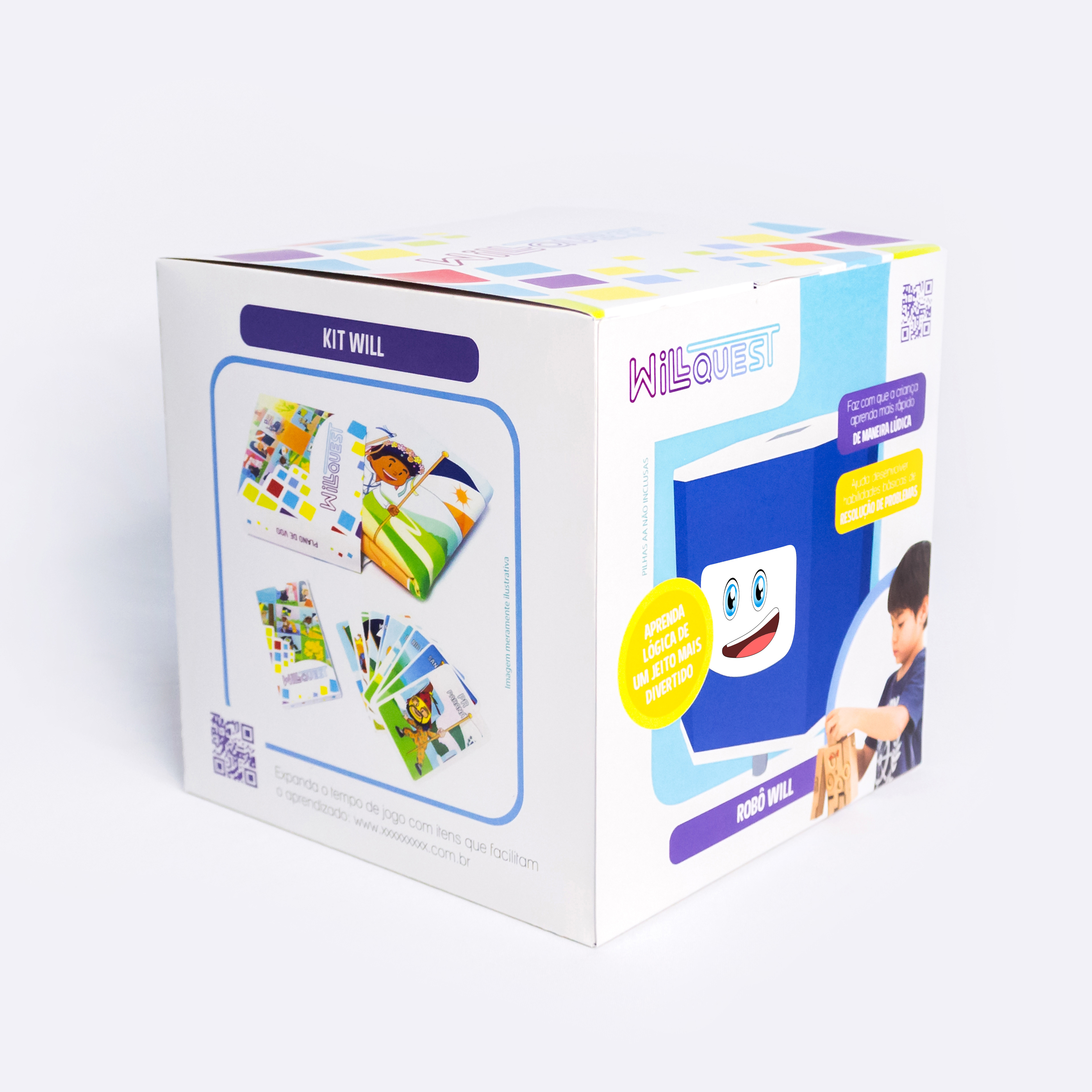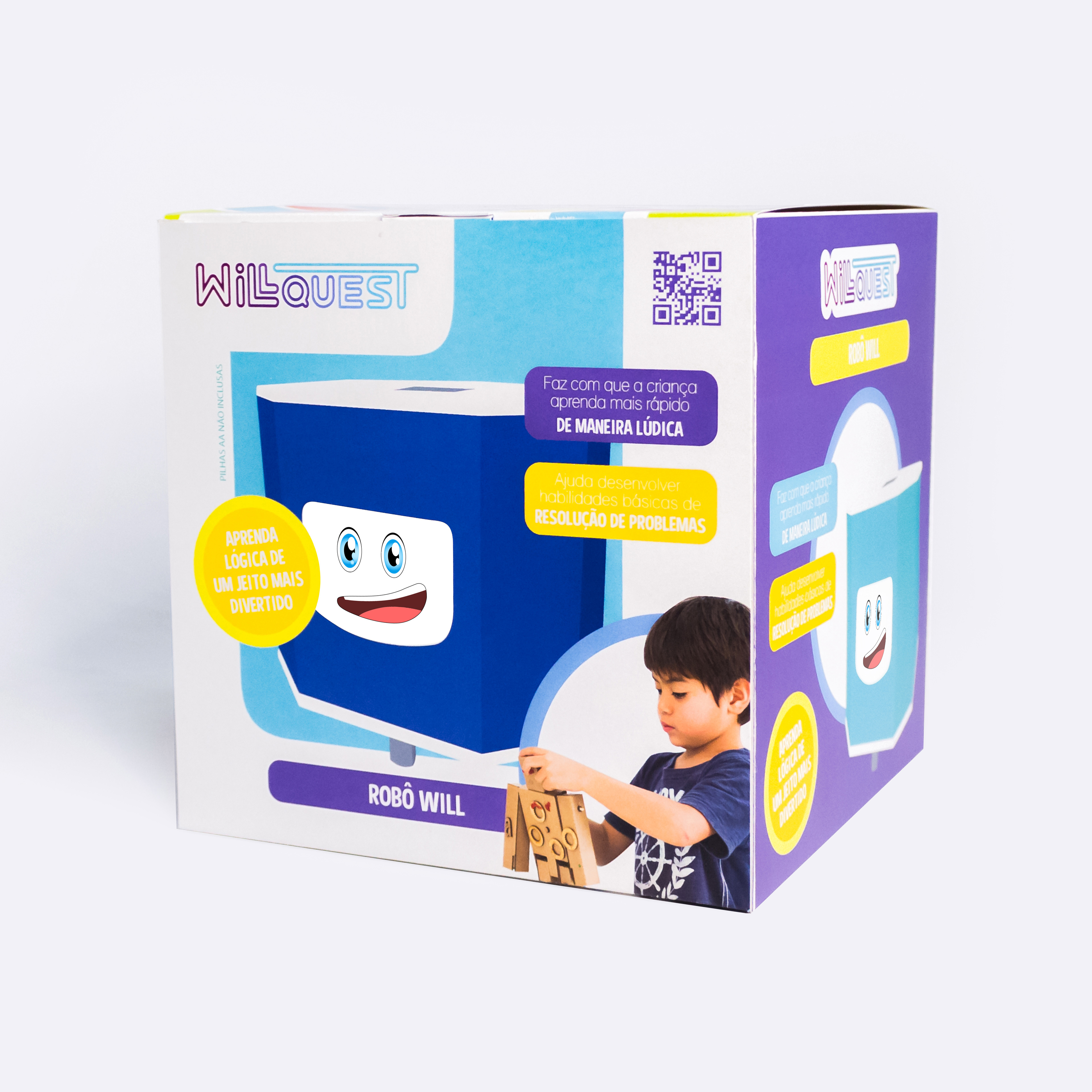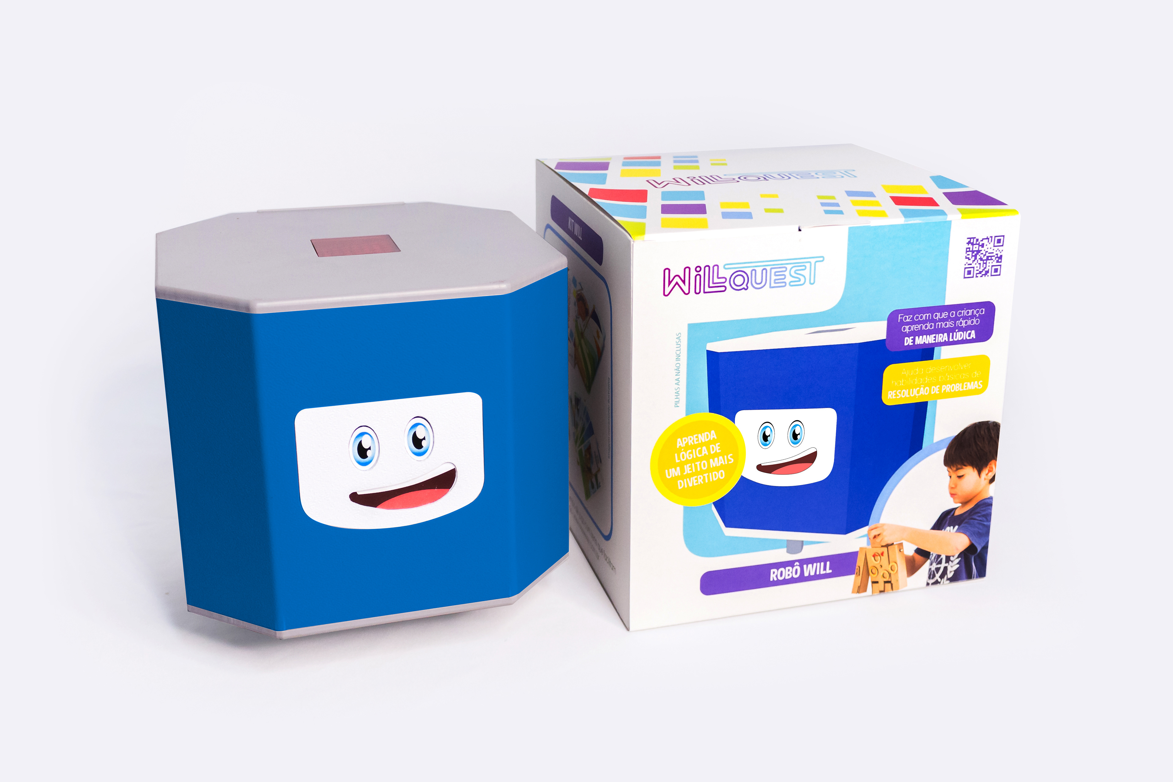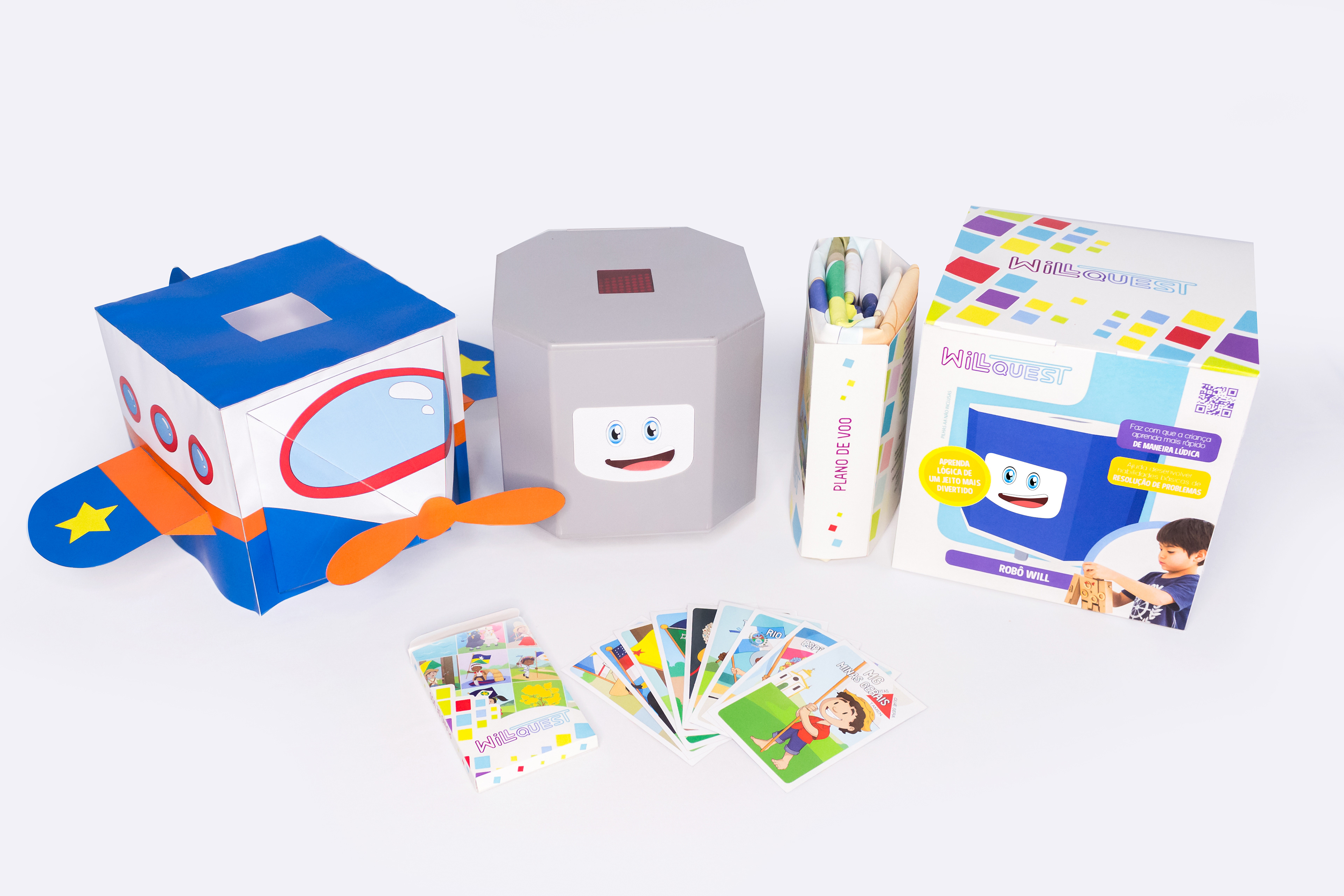 This project was created from scratch, including naming "Will + Quest (Will questions)", visual identity, prototype, production and photography. It was also required the design of packaging, which can be used as a means of transport, manual and product advertising. It was done in a way that is attractive to the child directly at the point of sale. The final product consists of packaging, activity mat, card kit, a paper kraft themed and the Will robot.